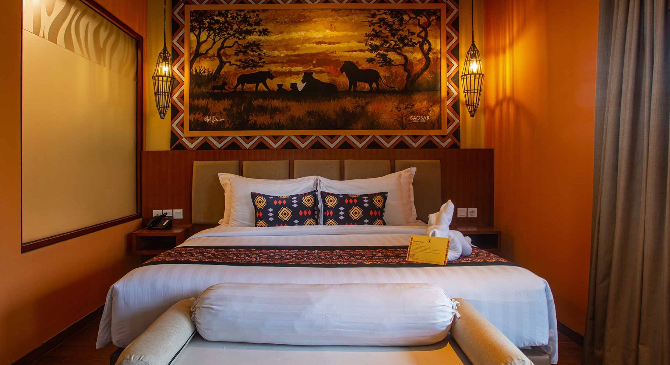 Experience a unique safari-insipired room at Baobab Safari Resort near Taman Safari Prigen in Pasuruan, East Java, where modern comfort meets breathtaking wildlife views for an unforgettable safari stay.