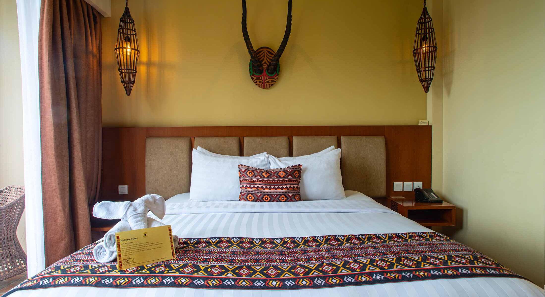 24 m² The Deluxe Hill View Room at Baobab Safari Resort offers a comfortable and relaxing stay surrounded by the lush hills of Prigen, East Java. Inspired by African safari design, the room blends warm natural tones with modern comfort, creating a peaceful retreat near Taman Safari Prigen.